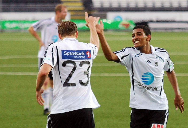 Niklas Gunnarsson gratuleres av Jonas Heiland. Odd 2 - Ålgård sep. -11. Foto: Morten Tollefsen